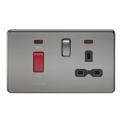 KnightsBridge 2G 45A DP 230V Screwless Black Nickel Electric Switch With Neon and Socket Insert