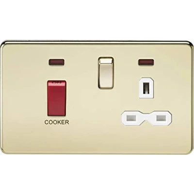 The Knightsbridge 45 Amp 2G Double Pole Screwless Cooker Control Unit in Polished Brass enables isolation of the unit so maintenance and cleaning can be safely carried out. The screwless design features an easy clip on decorative metal cover with an internal gasket for moisture protection and matching screws. The Double Pole switch and socket is constructed from a durable, scratch resistant thermoset plastic material. Switch can control two or more cooking appliances in the same room, providing rating is sufficient. A light weight and compact Control Units measuring 148.5mm width x 87.5mm height. Complies to all relevant safety standards and comes with a 15 year manufacturer guarantee and CE marked. The Screwless Cooker Control Switch is also available in Brushed Chrome, Black Nickel, Matt Black and Polished Chrome.