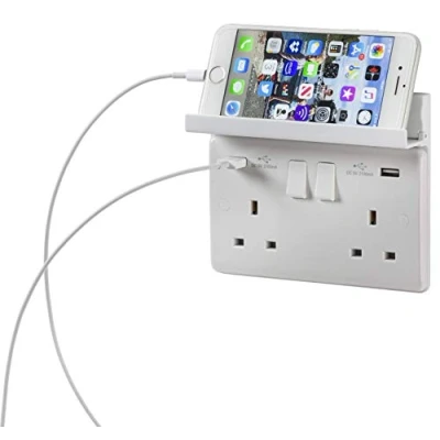AmazonFlip down phone holder for use with double switched sockets with USB charging facility. 2 piece install - no need to remove socket from wall Fits behind the existing double switched socket This fold down shelf supports your device whilst charging, allowing you to fold up when not in use Shown fitted to a Knightsbridge CU9904 twin socket and a compatible phone cable (not included), Weight: 0.110231131 Pounds, Manufacturer: KNIGHTSBRIDGE