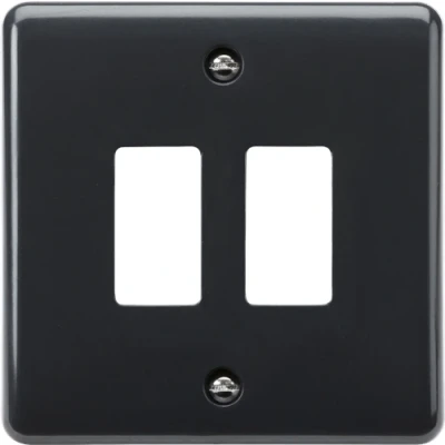 2G grid faceplate [Part M Compliant]The Curved Edge range has been expanded to include a range of wiring accessories that comply with current Building Regulations Part M. It is recommended that switches contrast with the front plate which in turn contrast with the wall. This range satisfies both recommendations. With a Light Reflectance Value (LRV) of approx. 8.9 (Part M recommends a contrast of 30% LRF between front plate and wall) Benefits Inherent Anti-microbial properties €“ 3rd party tested Certified to all relevant British Safety standards Features Use in conjunction with 1 x CUG1F (sold separately) Supports 2 Curved Edge grid modules Technical Specification:Height: 86Width: 86Projection: 7Construction: Thermoset resinFinish: AnthraciteIP Rating: IP20Positions: 2GPlate Size: SingleGrid Product: YesDimensions: Height: 86mmWeight: 0.038KgWarranty: 25 Years
