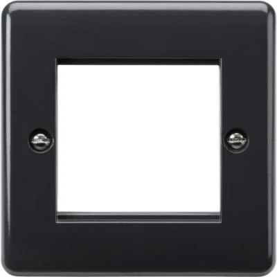 2G Modular Faceplate [Part M Compliant]The Curved Edge range has been expanded to include a range of wiring accessories that comply with current Building Regulations Part M. It is recommended that switches contrast with the front plate which in turn contrast with the wall. This range satisfies both recommendations. With a Light Reflectance Value (LRV) of approx. 8.9 (Part M recommends a contrast of 30% LRF between front plate and wall) Benefits Inherent Anti-microbial properties €“ 3rd party tested Certified to all relevant British Safety standards Features Single size suitable for 2 x 25x50mm, or 1 x 50x50mm euro-module Used to house euro-module inserts to create bespoke TV/SAT/HDMI/USB solutions Technical Specification:Height: 86Width: 86Projection: 7Construction: Thermoset resinFinish: AnthraciteIP Rating: IP20Positions: 2GPlate Size: SingleDimensions: Height: 86mmWeight: 0.037KgWarranty: 25 Years