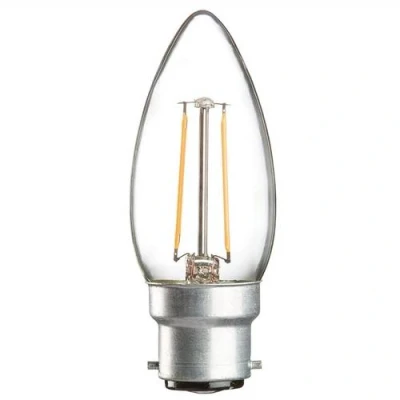 Knightsbridge 230V 2W LED 35mm BC Clear Candle Bulb 3000K CL2BCC This 2W BC(B22d) bayonet cap clear candle lamp utilises LED filament technology and is almost identical in appearance to a classic incandescent light bulb. Producing a warm white (3000K) 360 degree light, cool burning and long life, this lamp is ultra-efficient and reduces maintenance costs. Average life expectancy of 20,000 hours, 2 year warranty, 210 lumens (similar to a 25W incandescent). Non -dimmable. Diameter: 35mm Length: 92mm