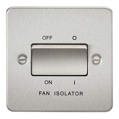 Flat Plate 10AX 3 Pole Fan Isolator Switch - Brushed Chrome FP1100BC Ideal for providing a safe and simple method of isolating fan units in en-suite bathrooms, family bathrooms, utility rooms, store rooms etc. Often the fan unit will be wired into the lighting circuit for convenience and efficiency. With this kind of installation there is often a need to leave the lighting circuit live whilst isolating the fan for maintenance. Flat Plate low profile metal design with matching metal rocker. 10AX rated Triple Pole Ultra low profile design with built-in gasket Certified to EN 60669-1 Minimum mounting box 16mm IP20 Height 87.5 mm Projection 2.5 mm Width 87.5 mm