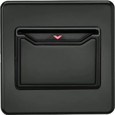 Ideal for Hotel rooms, flawless Screwless low profile metal design. Generally used to activate power and lighting in hotel rooms via the rooms key card. Power is cut to the room 30 seconds after withdrawal of the key card. - 32A rated - Back light arrow to aid activation in dark room - Screwless low profile design with built in gasket - Certified to EN 60669-1 - Minimum mounting box 47mmTechnical Specification:Projection: 4.3Recessed Depth: 31.5Min. Mounting Box Depth: 47mmConstruction: Premium grade steel & ABSFinish: AnthraciteClass: IIP Rating: IP20Primary Voltage: 230V 50HzEarth Terminal: YesNeon Indicator: YesDimensions: Height: 88mmWeight: 0.194KgWarranty: 2 Years