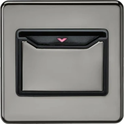 Electrical WorldIdeal for Hotel rooms, flawless Screwless low profile metal design. Generally used to activate power and lighting in hotel rooms via the rooms key card. Power is cut to the room 30 seconds after withdrawal of the key card. - 32A rated - Back light arrow to aid activation in dark room - Screwless low profile design with built in gasket - Certified to EN 60669-1 - Minimum mounting box 47mmTechnical Specification:Projection: 4.3Recessed Depth: 31.5Min. Mounting Box Depth: 47mmConstruction: Premium grade steel & ABSFinish: Black NickelClass: IIP Rating: IP20Primary Voltage: 230V 50HzEarth Terminal: YesNeon Indicator: YesDimensions: Height: 88mmWeight: 0.194KgWarranty: 2 Years