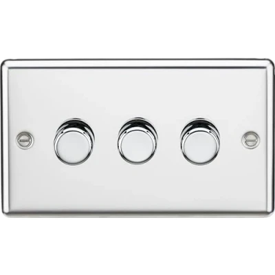 Electrical WorldPerfect finishing touch to any modern home, round edge metal design with matching metal cap 10-200W incandescent10-150W mains voltage halogen10-150W LV halogen with electronic transformer5-150W LED dimmable lamp2-wayPush on/offRotary action dimmerAnti-FlickerTrimming functionSwitchable from Trailing Edge to Leading EdgeOverload and Over Temperature protectionInrush Current Limiter (ICL)NB: PLEASE CHECK WITH LAMP MANUFACTURER FOR COMPATIBILITYTechnical SpecificationHeight: 85.75Width: 146.5Projection: 7.5Min. Mounting Box Depth: 25mmConstruction: Premium grade steelFinish: Polished ChromeClass: IIP Rating: IP20Primary Voltage: 230V 50HzEarth Terminal: YesTerminal: ScrewTechnical Specification:IP Rating: IP20 Colour: Polished ChromeDimensions: Height: 86mmWeight: 0.262KgWarranty: 2 Years