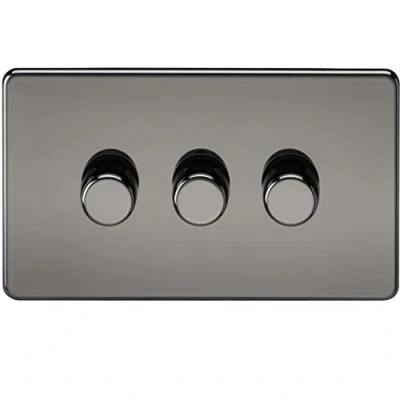 Perfect finishing touch to any modern home, flawless Screwless low profile metal design with matching dimmer caps.10-200W incandescent10-150W mains voltage halogen10-150W LV halogen with electronic transformer5-150W LED dimmable lamp2-wayPush on/offRotary action dimmerAnti-FlickerTrimming functionSwitchable from Trailing Edge to Leading EdgeOverload and Over Temperature protectionInrush Current Limiter (ICL)NB: PLEASE CHECK WITH LAMP MANUFACTURER FOR COMPATIBILITYTechnical SpecificationHeight: 87.5Width: 147.5Projection: 4.3Recessed Depth: 21.3Min. Mounting Box Depth: 25mmConstruction: Premium grade steelFinish: Black NickelClass: IIP Rating: IP20Primary Voltage: 230V 50HzEarth Terminal: YesTerminal: ScrewTechnical Specification:IP Rating: IP20 Colour: Black NickelDimensions: Height: 88mmWeight: 0.38KgWarranty: 2 Years