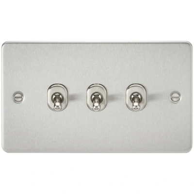 3G 2 Way Toggle Switch Flat Plate- Brushed Chrome The perfect finishing touch to any modern home, ultra-low profile Flat Plate metal design with matching metal toggle. 10AX 2-way switches are generally used when there are two entrances to a room, where there is a switch positioned at either entrance requiring joint control of the lighting. 10AX rated Ultra-low profile Flat Plate design with built in gasket Certified to EN 60669-1 Minimum mounting box 16mm Dimensions: H 87.5 x W 148.5mm IP20