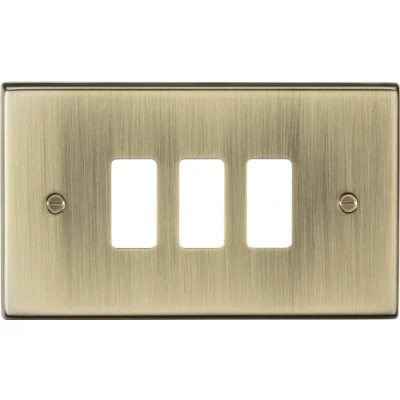 3G grid faceplate - antique brassDesigned and finished to coordinate with the Square Edge Antique Brass Switches and Sockets range. 3G Square Edge Grid Faceplate Use in conjunction with 1 x GDF002F (sold separately) FOR USE WITH KNIGHTSBRIDGE GRID SYSTEM ONLYTechnical Specification:Height: 89Width: 89Projection: 10.5Construction: Premium grade steelFinish: Antique BrassIP Rating: IP20Positions: 3GPlate Size: DoubleGrid Product: YesDimensions: Height: 89mmWeight: 0.141KgWarranty: 25 Years