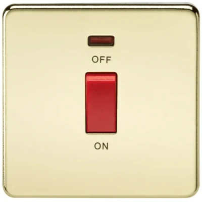 KnightsBridge 45A 1G DP 230V Screwless Polished Brass Electric Switch With Neon and
