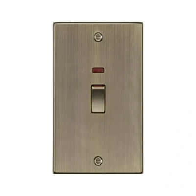 45A 2G DP switch with neon - antique brassCooker control units enable isolation of the unit so that maintenance and repairs to be carried out separately. The unit can be switched off, preventing the appliance from being turned on accidentally - for example whilst cleaning. Control two or more cooking appliances in the same room, providing rating is sufficient. 45A Double pole With neon indicator Minimum mounting box depth: 47mm Technical Specification:Height: 149.3Width: 89Projection: 10.5Min. Mounting Box Depth: 47mmConstruction: Premium grade steelFinish: Antique BrassClass: IIP Rating: IP20Primary Voltage: 230V 50HzPositions: 1GPlate Size: DoubleSwitch Type: Double PoleLoad/Max. Load: 45AEarth Terminal: YesNeon Indicator: YesTerminal Capacity: 2 x 6.0mm² or 3 x 4.0mm²Dimensions: Height: 149mmWeight: 0.275KgWarranty: 25 Years