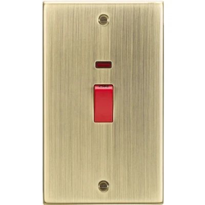 Cooker control units enable isolation of the unit so that maintenance and repairs to be carried out separately. The unit can be switched off, preventing the appliance from being turned on accidentally - for example whilst cleaning. Control two or more cooking appliances in the same room, providing rating is sufficient. Square edge metal design - 45A - Double pole - With neon indicator - Square edge design with built in gasket - Certified to EN 60669-1 - Minimum mounting box depth: 47mmTechnical Specification:Projection (mm): 10.5Min. Mounting Box Depth (mm): 47mmConstruction: Premium grade steelFinish: Antique BrassIP Rating: IP20Primary Voltage: 230V 50HzEarth Terminal: YesNeon Indicator: YesTerminal: ScrewDimensions: Height: 149mmWeight: 0.275KgWarranty: 15 Years