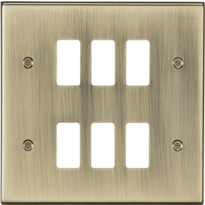 6G grid faceplate - antique brassDesigned and finished to coordinate with the Square Edge Antique Brass Switches and Sockets range. 6G Square Edge Grid Faceplate Use in conjunction with 2 x GDF002F (sold separately) FOR USE WITH KNIGHTSBRIDGE GRID SYSTEM ONLYTechnical Specification:Height: 149.3Width: 149.3Projection: 10.5Construction: Premium grade steelFinish: Antique BrassIP Rating: IP20Positions: 6GPlate Size: 2 x DoubleGrid Product: YesDimensions: Height: 149mmWeight: 0.22KgWarranty: 25 Years