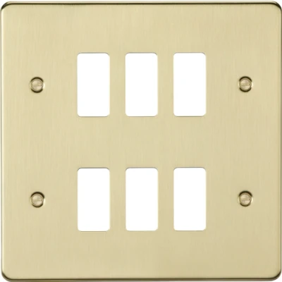 Designed and finished to coordinate with the Flat Plate Switches and Sockets range. 6G Flat Plate Grid Faceplate - Use in conjunction with 2 x GDF002F (sold seperately) FOR USE WITH FLAT PLATE GRID SYSTEM ONLYTechnical Specification:Projection: 3.5Construction: Premium grade steelFinish: Brushed BrassIP Rating: IP20Dimensions: Height: 148mmWeight: 0.159KgWarranty: 15 Years
