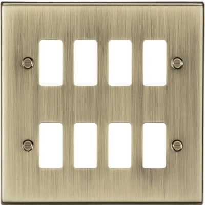 8G grid faceplate - antique brassDesigned and finished to coordinate with the Square Edge Antique Brass Switches and Sockets range. 8G Square Edge Grid Faceplate Use in conjunction with 2 x GDF002F (sold separately) FOR USE WITH KNIGHTSBRIDGE GRID SYSTEM ONLYTechnical Specification:Height: 149.3Width: 149.3Projection: 10.5Construction: Premium grade steelFinish: Antique BrassIP Rating: IP20Positions: 8GPlate Size: 2 x DoubleGrid Product: YesDimensions: Height: 149mmWeight: 0.211KgWarranty: 25 Years