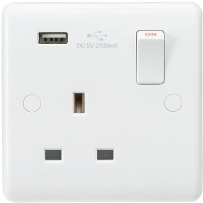 KnightsBridge Curved Edge 13A 1G Switched Socket with USB Charger (5V DC 2.1A)