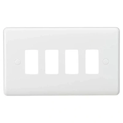 Electrical WorldDesigned and finished to coordinate with the Curved Edge Switches and Sockets range. 4G Curved Edge Grid Faceplate- Use in conjunction with 1 x CUG2F (sold separately)- Supports 4 Curved Edge Grid Modules- Includes screw cap covers- Supplied in Knightsbridge rip top polybag with euro slotFOR USE WITH CURVED GRID SYSTEM ONLYSpecification: Projection (mm): 7Construction: Thermoset resinFinish: WhiteIP Rating: IP20