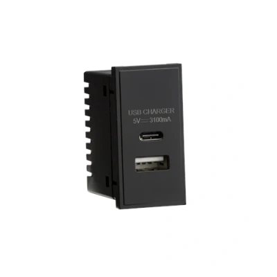 Dual USB charger outlet suitable for use with euro-module faceplates. - 25 x 50mm - Input: 230V 0.4A - Output: 5V DC 3.1A / 15.5W (shared) - Dual USB charger 5V DC 3.1A (shared) - 1 x Type-A - 1 x Type-C - With overload protection - Certified to BS 5733, BS EN 62368Technical Specification:Depth (mm): 36.5Min. Mounting Box Depth (mm): 35mmConstruction: ABSFinish: BlackClass: IIIP Rating: IP20Primary Voltage: 230V 50HzDimensions: Height: 50mmWeight: 0.054KgWarranty: 1 Year