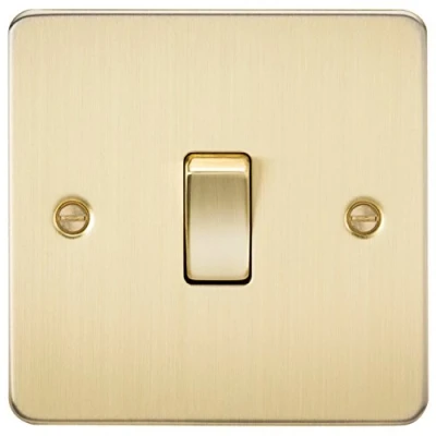 Perfect finishing touch to any modern home, ultra-low profile Flat Plate metal design with matching metal rocker.10AX 2-way switches are generally used when there are two entrances to a room, where there is a switch positioned at either entrance requiring joint control of the lighting.- 10AX rated- Ultra-low profile Flat Plate design with built in gasket- Certified to EN 60669-1- Minimum mounting box 16mmSpecification: Projection (mm): 2.5Min. Mounting Box Depth (mm): 16mmConstruction: Premium grade steelFinish: Brushed BrassClass: IIP Rating: IP20Primary Voltage: 230V 50HzEarth Terminal: Yes