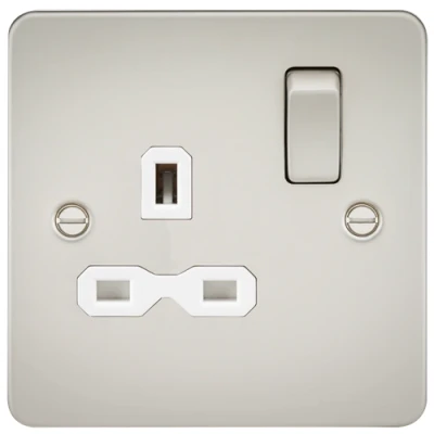 Perfect finishing touch to any modern home, ultra-low profile Flat Plate metal design with matching metal rocker, unique socket insert design that is completely hidden once a plug is inserted.- 13A 1G Switched Socket- Double Pole Switch- Flat Plate low profile design with built in gasket- Certified to BS 1363:2- Minimum mounting box depth 25mmSpecification: Projection (mm): 2.5Min. Mounting Box Depth (mm): 25mmConstruction: Premium grade steelFinish: PearlIP Rating: IP20Primary Voltage: 230V 50HzEarth Terminal: Yes