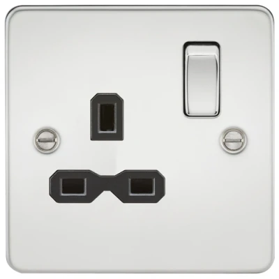 The Knightsbridge Flat Plate 13A 1G DP Switched Socket in polished chrome with a black insert is the perfect finishing touch for any modern home. Designed with an ultra-low profile, this flat plate metal socket integrates seamlessly with a contemporary aesthetic while providing functionality at its core. The unique socket insert design ensures that the insert is completely hidden when a plug is inserted, maintaining a sleek appearance.