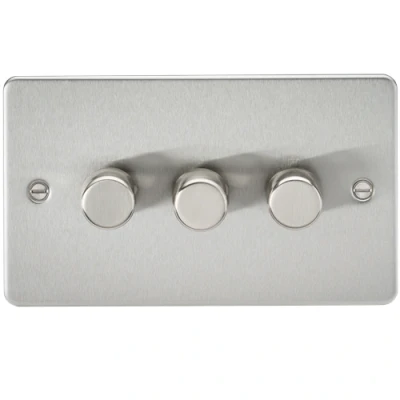 Perfect finishing touch to any modern home, Flat Plate low profile metal design with matching dimmer cap. - 10-200W Incandescent - 5-150W LED - 2-way - Push on/off - Trailing edge dimmer technology - Certified to EN 60669-2 - Minimum mounting box depth: 25mmNB: PLEASE CHECK WITH LAMP MANUFACTURER FOR COMPATIBILITYSpecification: Projection (mm): 2.5Min. Mounting Box Depth (mm): 25mmConstruction: Premium grade steelFinish: Brushed ChromeIP Rating: IP20Primary Voltage: 230V 50HzEarth Terminal: Yes