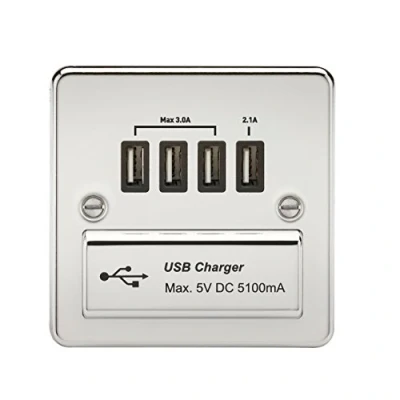 Ideal solution for multiple users, dedicated Quad USB charger. Flat Plate low profile metal design with matching metal rockers. Perfect for Coffee shops. foyers, receptions, hotel rooms etc. - Quad USB Charging 5V DC5.1A (shared) - Dedicated 2.1A outlet for tablets - 3 outlets sharing 3A for multiple smart phones and other devices - Ultra low profile design with built in gasket - Certified to BS EN 60670, EN 60950-1 - EMC Certified and ErP Ready - Minimum mounting box depth 25-35mm**dependent on wiring conditionsWE RECOMMEND YOU ALWAYS USE CERTIFIED USB CABLES FOR SAFETY AND TO ENSURE COMPATIBILITYSpecification: Projection (mm): 2.5Min. Mounting Box Depth (mm): 25mmConstruction: Premium grade steelFinish: Polished ChromeIP Rating: IP20Primary Voltage: 230V 50HzEarth Terminal: Yes