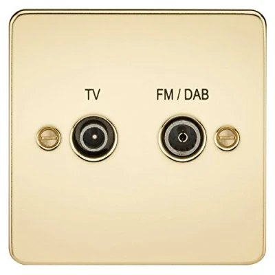 Ideal for TV, FM/DAB coaxial connections. Screened diplexer enables the signal from one cable to be used for both Digital TV reception and FM DAB reception. Flat Plate low profile design - 1 x Coaxial TV outlet (female) - 1 x Coaxial FM/DAB outlet (male) - Screened - Ultra low profile design with built in gasket - Certified to BS 5733 - Minimum mounting box depth: 35mmTechnical Specification:Projection (mm): 2.5Min. Mounting Box Depth (mm): 35mmConstruction: Premium grade steelFinish: Polished BrassIP Rating: IP20Earth Terminal: YesTV Connection Type: MaleFM/DAB Connection Type: FemaleTerminal: Clamp & Screw TerminalDimensions: Height: 88mmWeight: 0.248KgWarranty: 15 Years