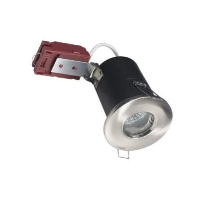 Knightsbridge 50W Shower Downlight The Knightsbridge die cast fixed 90 minute fire rated downlight is compatible with GU10 11W Energy Saving Halogen Lamps. These downlights are sure to bring style to your lighting solution. Features a double insulated fitting with a twist and lock front ring, ensuring the security of the attached bulb. This model holds an IP65 rating, meaning they are ideal for uses such as in bathrooms with showers, or patio use, as they are resistant to weather, water, and dirt. Electrical termination is via a 10A connector block within a secure enclosure which comes with a cord grip. This product comes with spring clip fixings for a recommended maximum ceiling thickness of 30mm and is dimmable. This product is suitable for direct mounting on normally flammable surfaces. Note: Bulb is not included in this purchase Technical Specification: Recommended product location: Indoor Finishes available: White, Brass, Chrome, Brushed Chrome, Control Gear Type: N/A Lamp Supplied: No Class: Class I Should be earthed IP: IP65 Photometric Testing: Yes Dimmable?: No Outer diameter 87mm Recessed depth 130mm Recommended ceiling void required 150mm Recommended maximum ceiling thickness of 30mm Cut-out 72mm. Main Materials: Chassis: Pressed Steel Bezel: Die cast Fixing Method & Certs: Method of fix: Twin spring-loaded brackets Lampholder cap and make: GU10 Electrical Connections: 10Amp L.N.E Nylon Connector, Screw Terminals F mark: Yes CE mark: Yes Manufactured in accordance to EN60598-1 General requirements, EN60598-2-1 Fixed general purpose luminaires, EN60598-2-2 Recessed luminaires, BS5250 (Energy efficiency, Useful heat loss and passage of condensation), BS EN ISO 140 (Parts 1& 2):1997. (Acoustic), Part P (Installation requirements), BS476 – Part 21 & Part 23 Fire rating Comes with a 1 Year Manufacturer's Warranty.