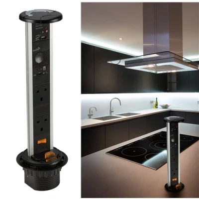 IP54 rated pop up socket for use in kitchen counter tops, offices, boardrooms and hotel rooms. Wherever a discreet power solution is required. This device has a secure clip that locks the unit upright when in use, you can also close the unit with cables plugged in via its innovative cable management cap and inverted socket positions. - IP54 rated - 2 x 13A sockets with back lit on/off rocker at base - Built in dual USB charger 5V DC 2.4A (shared) with on/off control - Built in Bluetooth Speaker (2W RMS) with volume control and headphone port - Fitted with 2m cable and BS plug top - Aluminium casing with black top cap and chrome handle - Minimum mounting board thickness: 10-50mm - Cut out: 90-92mm (allowing a minimum 25mm clearance around the cut hole) - Certified to BS 1363-2, BS 5733WE RECOMMEND YOU ALWAYS USE CERTIFIED USB CABLES FOR SAFETY AND TO ENSURE COMPATIBILITYSpecification: Diameter (mm): 101Projection (mm): 15Minimum Void: 445Cut-out Diameter: 90Construction: AluminiumConstruction 2: & polycarbonateFinish: BlackClass: IIP Rating: IP54Primary Voltage: 230V 50HzCable Length: 2Neon Indicator: Yes
