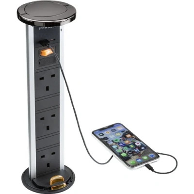 IP54 rated pop up socket for use in kitchen counter tops, offices, boardrooms and hotel rooms. Wherever a discreet power solution is required. This device has a secure clip that locks the unit upright when in use, you can also close the unit with cables plugged in via its innovative cable management cap and inverted socket positions. - IP54 rated - 3 x 13A sockets with back lit on/off rocker at base - Built in Dual Fast Charge USB A+C - Fitted with 2m cable and BS plug top - Aluminium casing with die-cast metal top cap and handle - Mounting board thickness: 10-50mm - Cut out: 90-92mm (allowing a minimum 25mm clearance around the cut hole) Features - FASTCHARGE USB-C port compatible with QC2.0/QC3.0 and USB-PD - FASTCHARGE USB-A port compatible with QC2.0/QC3.0 - Capable of delivery 0-50% charge in under 30 mins with compatible phones - 80% faster than a standard 5V DC 2A charger - Compatible with Android based devices supporting QC2.0/QC3.0 and USB-PD (via USB-C port only) - Compatible with Apple devices supporting USB-PD (iPhone 8 and above, require certified Lightning to USB-C charge/sync cable) - High quality components to ensure longevity of installation Specification FASTCHARGE is achieved by switching voltage 5V-12V USB-C port - 5V DC 3A (15W) with standard devices - 9V DC 2A (18W) with QC and USB-PD compatible devices - 12V DC 1.5A (18W) with QC and USB-PD compatible devices USB-A port - 5V DC 2A (10W) with standard devices - 9V DC 2A (18W) with QC compatible devices - 12V DC 1.5A (18W) with QC compatible devices NB: Only one port can activate FASTCHARGE at any one-time, alternative port will revert to 5V DC 1A WE RECOMMEND ONLY USING CERTIFIED USB CABLES FOR SAFETY, OPTIMUM PERFORMANCE AND TO ENSURE COMPATIBILITYTechnical Specification:Diameter (mm): 100Projection (mm): 10Minimum Void: 445Cut-out Diameter: 90Construction: AluminiumConstruction 2: & polycarbonateFinish: Black NickelClass: IIP Rating: IP54Primary Voltage: 230V 50HzCable Length: 2Neon Indicator: YesWeight: 1.52KgWarranty: 2 Years