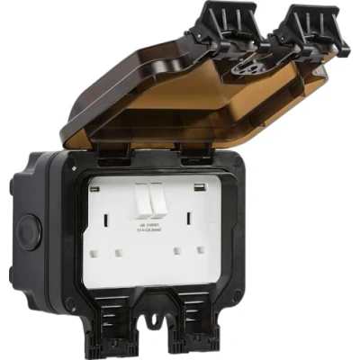 230V Outdoor weatherproof double power socket with power on and off indication that can be seen through the transparent lid *** NOT SUITABLE FOR EV CHARGING *** Manufactured from robust, high impact grade polycarbonate for a long life Black finish with a smoked black front casing for indicator visibility IP66 / IK06 impact rates Twin switched socket with dual USB A+C (5V DC 4.0A, Max 20W shared) with Transparent user-friendly lid with large catch feature makes it simple and easy to open and close, Lid can hold open when required for ease of use Wider cable channels and casing will accommodate most plugs with thick over-moulded strain reliefs typically associated with outdoor products, Multiple 20mm cable entries/exits allow for optimum positioning, and Certified to BS 1363-2