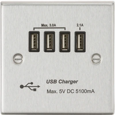 KnightsBridge Quad USB Charger Outlet (5.1A) Brushed Chrome with Black Insert