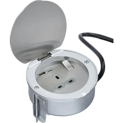 A recessed power solution with USB charging. Can be mounted in desktops, counter tops, or even furniture. Keeping all your power requirements hidden and out of the way till needed with just a 6mm projection when closed. This model has a stainless steel lid to protect/hide what's below. Supplied with a pre-fitted 2m cable with plug top for easy install. Ideal for Hot Desking areas, Home Offices and Hotel Desks. 13A 230V 1G Switched Socket Dual USB Charger A+C (5V DC 4.0A Max 20W) Stainless Steel finish with subtle grey inserts Cut our diameter of 112mm (recess depth of at least 79mm req) will mount in surfaces of 14-50mm