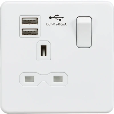 KnightsBridge Screwless 13A 1G switched socket with dual USB charger (2.4A) matt white