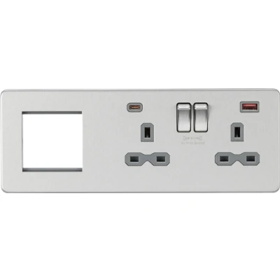 KnightsBridge Screwless 13A 2G DP Socket with USB Fastcharge + Modular Combination Plate Brushed Chrome, Grey Insert