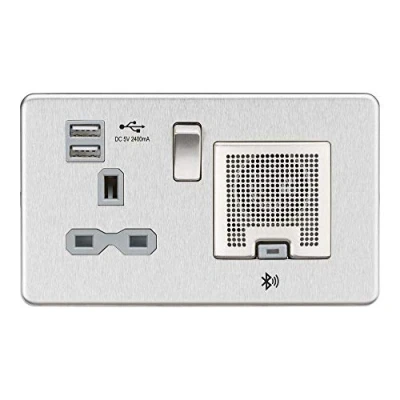 KnightsBridge Screwless 13A socket, USB chargers (2.4A) and Bluetooth Speaker Brushed chrome with grey insert