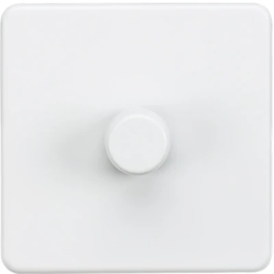Perfect finishing touch to any modern home, flawless Screwless low profile metal design with matching dimmer cap. - 10-200W Incandescent - 5-150W LED - 2-way - Push on/off - Trailing edge dimmer technology - Certified to EN 60669-2 - Minimum mounting box depth: 25mmNB: PLEASE CHECK WITH LAMP MANUFACTURER FOR COMPATIBILITYSpecification: Projection (mm): 4.3Recessed Depth (mm): 21.3Min. Mounting Box Depth (mm): 25mmConstruction: Premium grade steelFinish: Matt WhiteClass: IIP Rating: IP20Primary Voltage: 230V 50HzEarth Terminal: Yes