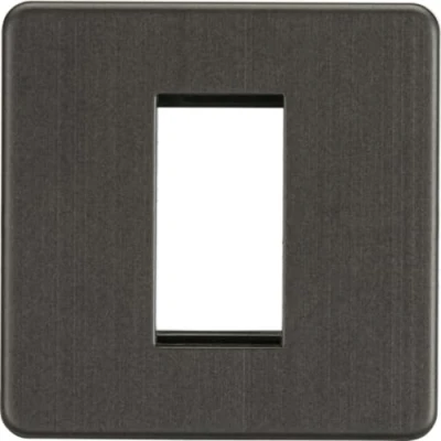 Electrical WorldSuitable for use with euro module inserts. Ideal for creating bespoke TV/DATA/HDMI/USB/TEL installations. Flawless Screwless design - Accepts a single 25 x 50mm euro module - Screwless low profile design with built in gasket - Minimum mounting box depth: dependent on euro module usedTechnical Specification:Projection (mm): 4.3Construction: Premium grade steelFinish: Smoked BronzeClass: IIP Rating: IP20Earth Terminal: YesDimensions: Height: 88mmWeight: 0.098KgWarranty: 15 Years