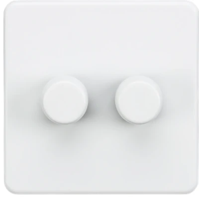Perfect finishing touch to any modern home, flawless Screwless low profile metal design with matching dimmer caps. - 10-200W Incandescent - 5-150W LED - 2-way - Push on/off - Trailing edge dimmer technology - Certified to EN 60669-2 - Minimum mounting box depth: 25mmNB: PLEASE CHECK WITH LAMP MANUFACTURER FOR COMPATIBILITYSpecification: Projection (mm): 4.3Recessed Depth (mm): 21.3Min. Mounting Box Depth (mm): 25mmConstruction: Premium grade steelFinish: Matt WhiteClass: IIP Rating: IP20Primary Voltage: 230V 50HzEarth Terminal: Yes
