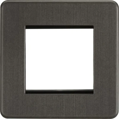 Electrical WorldSuitable for use with euro module inserts. Ideal for creating bespoke TV/DATA/HDMI/USB/TEL installations. Flawless Screwless design - Accepts two 25 x 50mm , or a single 50 x 50mm euro module - Screwless low profile design with built in gasket - Minimum mounting box depth: dependent on euro module usedTechnical Specification:Projection (mm): 4.3Construction: Premium grade steelFinish: Smoked BronzeClass: IIP Rating: IP20Earth Terminal: YesDimensions: Height: 88mmWeight: 0.098KgWarranty: 15 Years