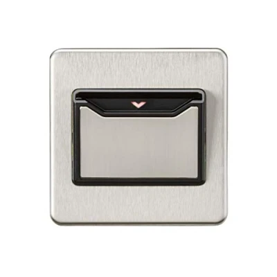 Electrical WorldIdeal for Hotel rooms, flawless Screwless low profile metal design. Generally used to activate power and lighting in hotel rooms via the rooms key card.Power is cut to the room 30 seconds after withdrawal of the key card.- 32A rated- Back light arrow to aid activation in dark room- Screwless low profile design with built in gasket- Certified to EN 60669-1- Minimum mounting box 47mmSpecification: Projection (mm): 4.3Recessed Depth (mm): 31.5Min. Mounting Box Depth (mm): 47mmConstruction: Premium grade steelConstruction 2: & ABSFinish: Brushed ChromeClass: IIP Rating: IP20Primary Voltage: 230V 50HzEarth Terminal: YesNeon Indicator: Yes