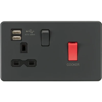 Cooker control units enable isolation of the unit so that maintenance and repairs to be carried out separately. The unit can be switched off, preventing the appliance from being turned on accidentally - for example whilst cleaning. Control two or more cooking appliances in the same room, providing rating is sufficient. This model combines a 45A switch with a 13A socket and the additional benefit of a built in dual USB Charger 5V DC 2.4A making use of what would normally be unused space. Flawless Screwless design. - 45A - Double pole - 13A switched socket - Dual USB Charger 5V DC 2.4A - Screwless low profile design with built in gasket - Certified to BS 4177, BS 1363-2, EN 62368-1 - Minimum mounting box depth: 47mm WE RECOMMEND YOU ALWAYS USE CERTIFIED USB CABLES FOR SAFETY AND TO ENSURE COMPATIBILITYTechnical Specification:Projection (mm): 4.3Min. Mounting Box Depth (mm): 47mmConstruction: Premium grade steelFinish: AnthraciteClass: IIP Rating: IP20Primary Voltage: 230V 50HzEarth Terminal: YesDimensions: Height: 88mmWeight: 0.358KgWarranty: 2 Years
