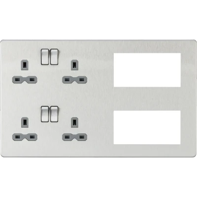 Brushed Chrome Finish & Grey Insert: Screwless, low-profile design with a sophisticated grey insert, perfect for modern interiors. All-in-One Power & Multimedia: Combines 2G sockets with modular inserts to provide a single solution for both power and bespoke signal distribution. Safe & Reliable 230V 13A Sockets: Includes 2 x 2G double sockets with twin earth and double pole switches for secure and dependable operation. Customisable Modular Design: Space for up to 8 x Euro module inserts (25 x 50mm), compatible with Satellite TV, DAB, Networking, USB charging, and more. Perfect for Upgrades & New Builds: Ideal for major renovations or new installations, providing a neat, professional, and future-proof solution.