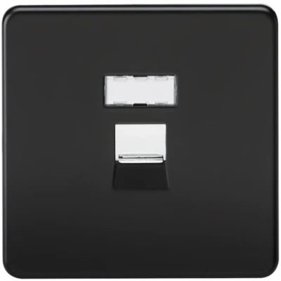 The Knightsbridge SFRJ45MB Screwless RJ45 Network Outlet in Matt Black with chrome shutter is a decorative single wall plate for the modern home. Ideal for creating wired networking points around the home. UTP CAT5e compliant RJ45 socket with IDC terminals. (IDC tool included) The decorative plate features an easy clip on cover with internal gasket for moisture protection and matching screws. It has an ultra slim profile and is made from high quality ultra slim, premium grade material and complete with integral gasket. A light weight and compact socket outlet with measurements Width 87.5mm x Height 87.5mm with a minimum mounting depth of 25mm. Complies to all relevant safety standards and comes with a 15 year manufacturer guarantee. This product is also available in Brushed Chrome, Black Nickel, Polished Brass and Polished Chrome.