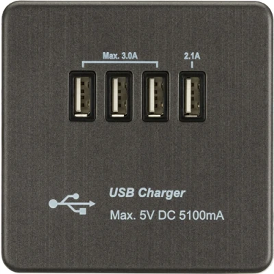 Ideal solution for multiple users, dedicated Quad USB charger. Screwless low profile metal design with matching metal rockers. Perfect for Coffee shops. foyers, receptions, hotel rooms etc. - Quad USB Charging 5V DC5.1A (shared) - Dedicated 2.1A outlet for tablets - 3 outlets sharing 3A for multiple smart phones and other devices - Screwless low profile design with built in gasket - Certified to BS EN 60670, EN 60950-1 - EMC Certified and ErP Ready - Minimum mounting box depth 25-35mm* *dependent on wiring conditions WE RECOMMEND YOU ALWAYS USE CERTIFIED USB CABLES FOR SAFETY AND TO ENSURE COMPATIBILITYTechnical Specification:Projection (mm): 4.3Min. Mounting Box Depth (mm): 25mmConstruction: Premium grade steelFinish: Smoked BronzeClass: IIP Rating: IP20Primary Voltage: 230V 50HzEarth Terminal: YesDimensions: Height: 88mmWeight: 0.24KgWarranty: 2 Years