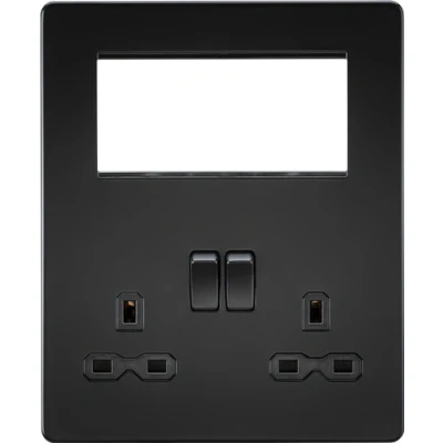 Essential for any major upgrade, renovation or new build. The Screwless Multimedia Combination Plate allows for a power and bespoke signal distribution solution to be combined in one area. Compatible with our extensive range of modular inserts this plate can be configured to suit your requirements, be it Satellite TV, DAB, Telecoms, Networking or even USB Charging. - 230V 13A - Double Pole Switches - 1 x 2G Double Sockets with Twin Earth - Space for up to 4 x Euro module inserts (25 x 50mm) - Dimensions: (H) XXXmm x (W) XXXmm x (P) XmmTechnical Specification:Construction: Premium grade steelFinish: Matt BlackClass: IIP Rating: IP20Primary Voltage: 230V 50HzEarth Terminal: YesWeight: 0.5KgWarranty: 15 Years