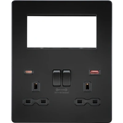 The Screwless Small Multimedia Combination Plate with FASTCHARGE in a sleek Matt Black finish is an essential choice for any major upgrade, renovation, or new build project. This innovative plate integrates power and bespoke signal distribution capabilities, making it a versatile solution for contemporary living spaces.