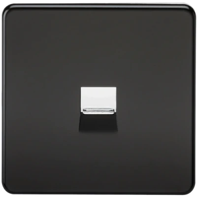 The Knightsbridge SF7400MB Screwless Telephone Extension Socket in Matt Black with chrome shutter is a decorative single wall plate ideal for the modern home. Secondary or extension telephone socket are used to run additional points of the original master socket. The decorative plate features an easy clip on cover with internal gasket for moisture protection and matching screws. It has an ultra slim profile and is made from high quality ultra slim, premium grade material and complete with integral gasket. The Master Socket is a standard BT type socket with screw type terminals, a surge arrestor with R/C circuit filter. These are used by your service provider to get a fixed value resistance when running line checks. A light weight and compact socket outlet with measurements Width 87.5mm x Height 87.5mm with a minimum mounting depth of 25mm. Complies to all relevant safety standards and comes with a 15 year manufacturer guarantee. This product is also available in Brushed Chrome, Black Nickel, Polished Brass and Polished Chrome.