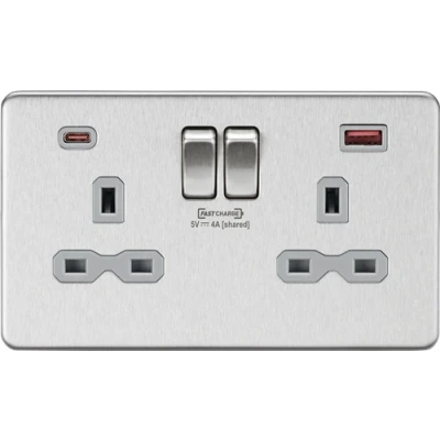 Knightsbridge SFR9909 Screwless Twin Switched Socket with Dual Fastcharge USB A+C Ports in Brushed Chrome Grey Insert